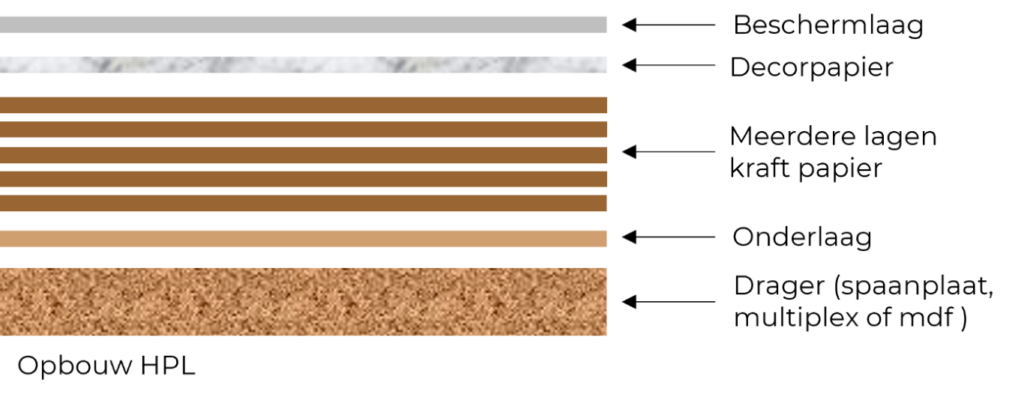 Zie hieronder een illustratie hoe HPL en Melamine opgebouwd zijn.