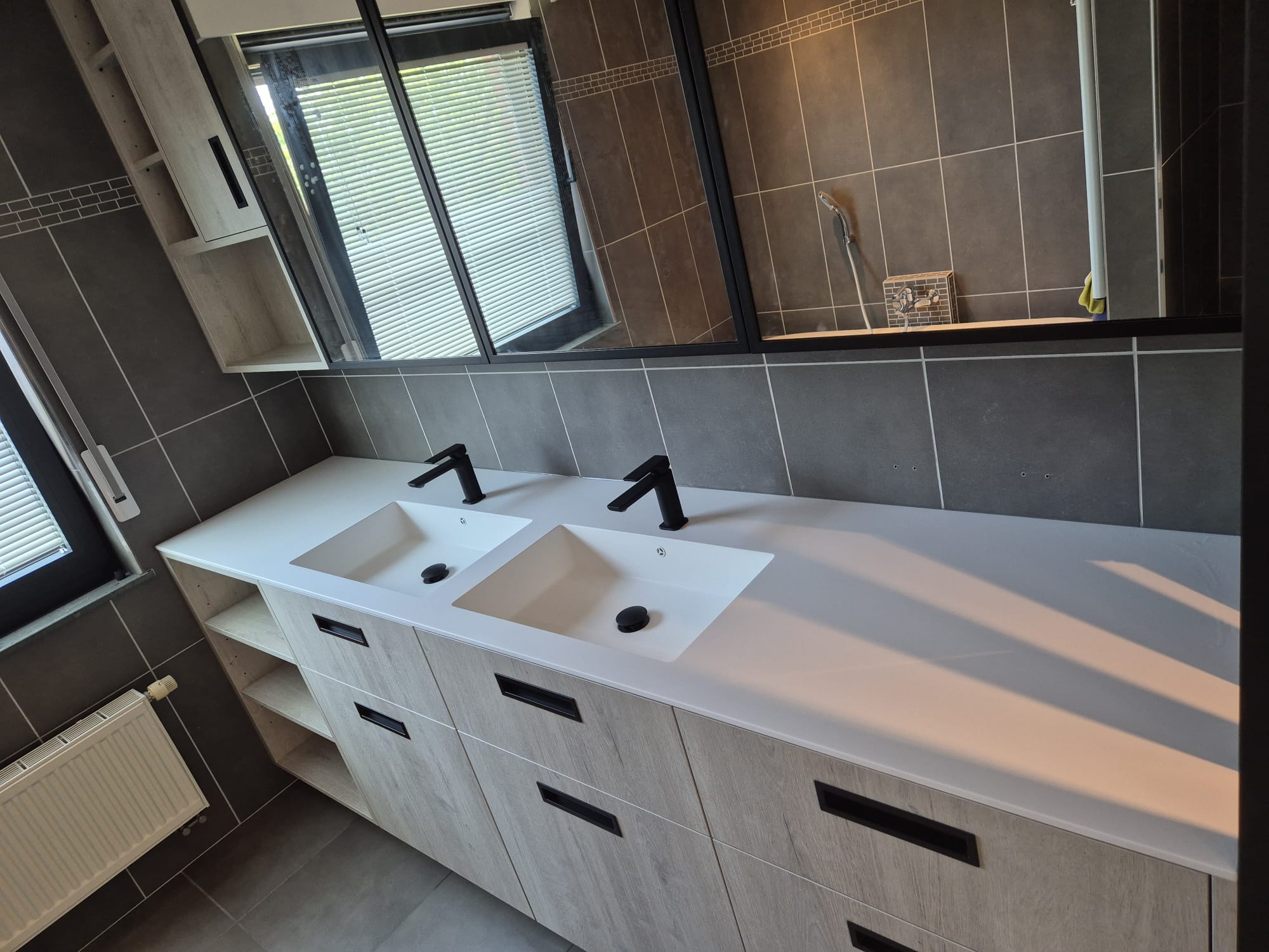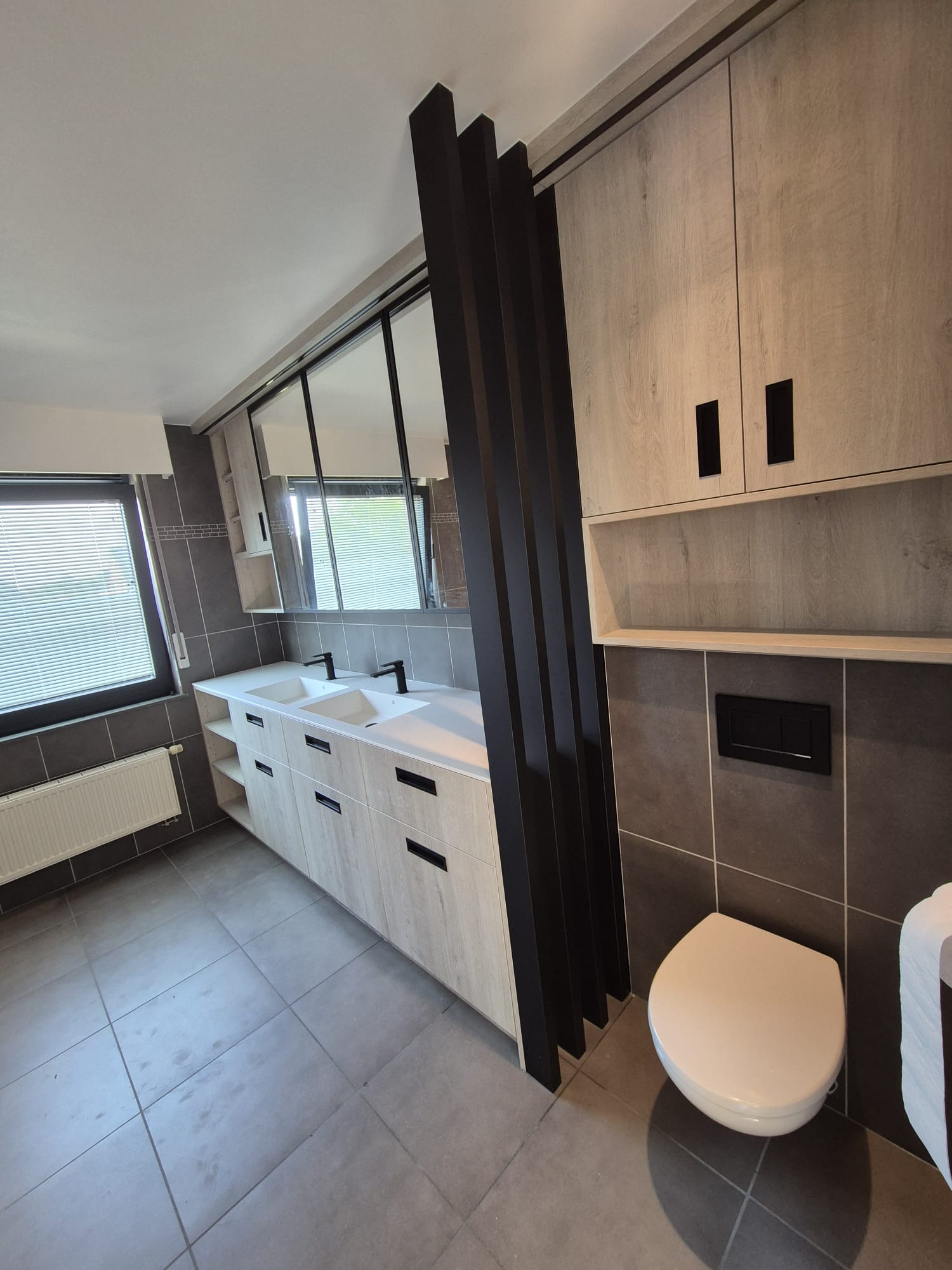 Het geheel wordt afgewerkt met zwarte accenten in de infreesgrepen, kranen, krepins, duwplaat en toiletrolhouder.