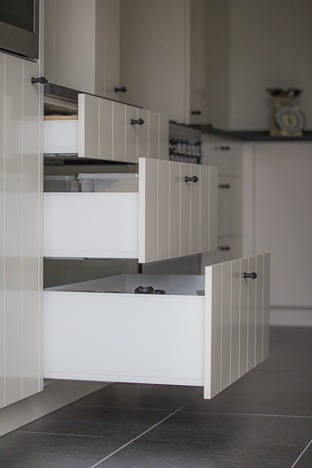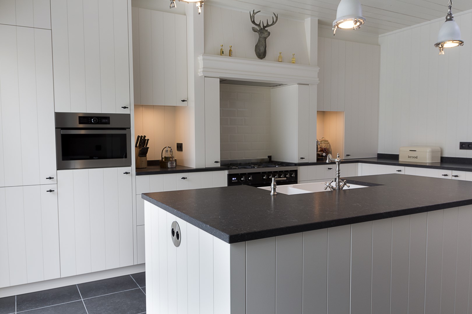 Keuken in landelijke stijl.Wit gelakte keuken met groeven.Zwarte composiet keukentabletten.Accentgreepjes om het geheel mooi bij te staan.