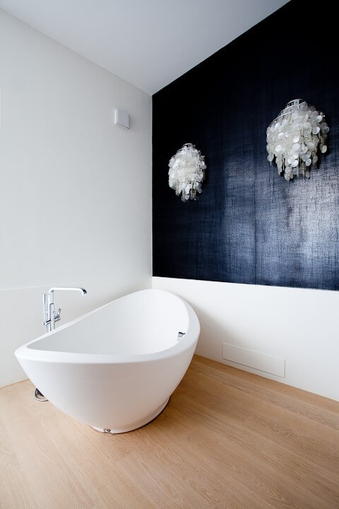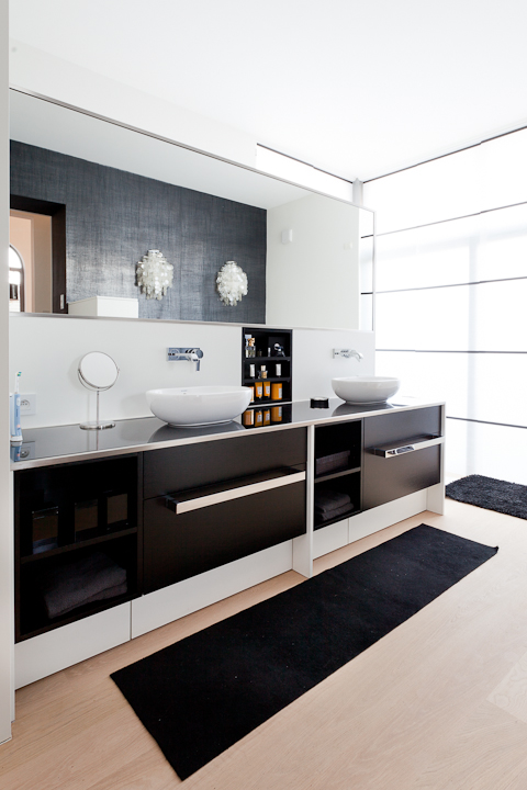 Slaapkamer met zwevende spiegelkasten om het zicht naar de benedenverdieping niet te belemmeren.