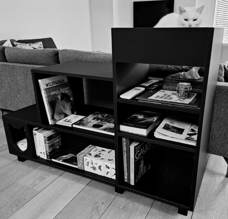 Onze schets voor een poezenboekenkast werd met zijn suggesties en